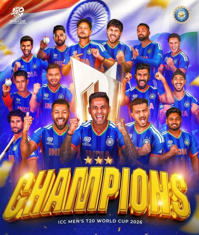 आईसीसी मेन्स टी20 वर्ल्ड कप 2026 के फाइनल में टीम इंडिया ने शानदार प्रदर्शन करते हुए न्यूजीलैंड को 96 रनों से हराकर खिताब अपने नाम कर लिया। अहमदाबाद के नरेंद्र मोदी स्टेडियम में खेले गए इस मुकाबले में भारत ने पहले बल्लेबाजी करते हुए 256 रनों का विशाल लक्ष्य रखा, जिसके जवाब में न्यूजीलैंड की टीम 159 रन पर ही सिमट गई। इस जीत के साथ ही भारत तीसरी बार टी20 वर्ल्ड कप चैंपियन बना और लगातार दूसरी बार खिताब जीतने वाली पहली टीम भी बन गया। भारत के लिए बल्लेबाजी में अभिषेक शर्मा, संजू सैमसन और ईशान किशन ने शानदार अर्धशतक लगाए। अभिषेक शर्मा ने सिर्फ 21 गेंदों में 52 रन की तूफानी पारी खेली। वहीं संजू सैमसन ने 46 गेंदों में 89 रन बनाकर टीम को मजबूत स्थिति में पहुंचाया। ईशान किशन ने भी तेज बल्लेबाजी करते हुए 23 गेंदों में 54 रन जड़े। अंत में शिवम दुबे ने 8 गेंदों में 26 रन की ताबड़तोड़ पारी खेलकर भारत का स्कोर 256 तक पहुंचा दिया।