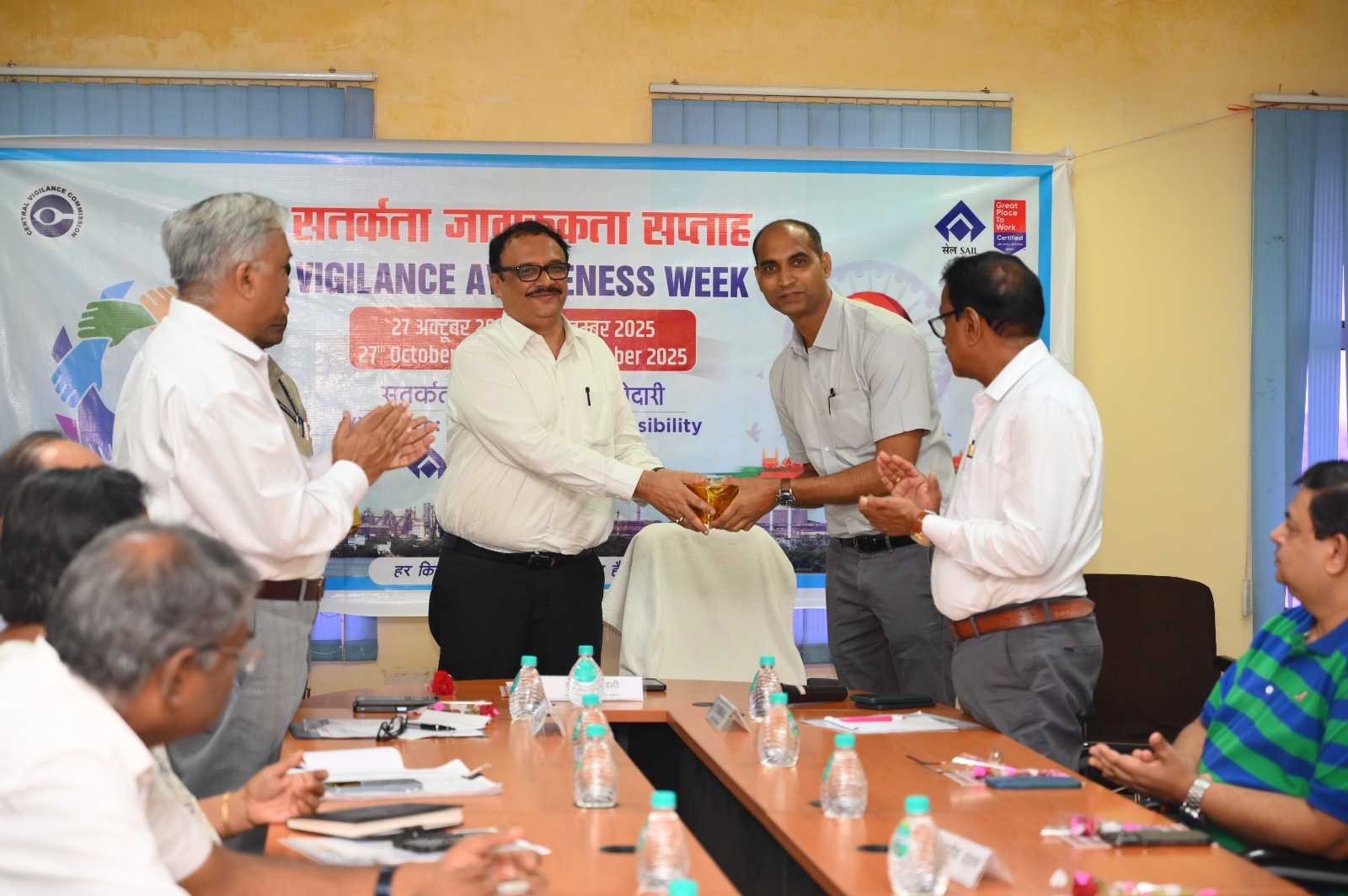 सतर्कता जागरूकता सप्ताह के उपलक्ष्य में, सेल-भिलाई इस्पात संयंत्र के विपणन एवं व्यवसाय नियोजन विभाग (एम एंड बीपी) द्वारा 19 सितंबर, 2025 को इस्पात भवन स्थित एम एंड बीपी सभागार में एक कस्टमर मीट समारोह का आयोजन किया गया। इस अवसर पर डिफेक्टिव स्टील स्क्रैप, स्लैग, कोल केमिकल्स, पिग आयरन और कमर्शियल रेल के ग्राहकों एवं खरीदारों के साथ-साथ संयंत्र के सतर्कता, वित्त, सुरक्षा, सी एंड आईटी, एमआरडी एवं अन्य संरक्षक विभागों के प्रतिनिधि उपस्थित थे।