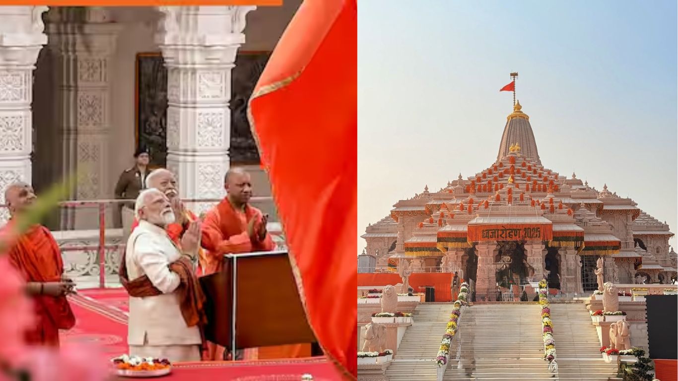 प्रधानमंत्री नरेंद्र मोदी और राष्ट्रीय स्वयंसेवक संघ (आरएसएस) प्रमुख मोहन भागवत ने मंगलवार 25 नवंबर को विवाह पंचमी के अवसर पर राम मंदिर के ‘शिखर’ पर भगवा ध्वज फहराया। पीएम मोदी ध्वजारोहण समारोह में शामिल होने वाले उच्च-स्तरीय गणमान्य व्यक्तियों में शामिल थे, साथ ही यूपी के मुख्यमंत्री योगी आदित्यनाथ और भागवत भी अन्य उपस्थित थे। दस फीट ऊंचे और बीस फीट लंबे धर्म ध्वज पर भगवान श्री राम के तेज और पराक्रम के प्रतीक सूर्य की छवि अंकित है, जिस पर कोविदारा वृक्ष की छवि के साथ ‘ओम’ अंकित है।पारंपरिक उत्तर भारतीय नागर स्थापत्य शैली में निर्मित श्री राम जन्मभूमि मंदिर शिखर पर भगवा ध्वज लहराते ही भक्त खुशी से झूम उठे। उत्तर प्रदेश के मुख्यमंत्री योगी आदित्यनाथ ने कहा कि श्री अयोध्या धाम में भगवान राम के भव्य मंदिर में ध्वजारोहण किसी यज्ञ की पूर्णाहुति नहीं, बल्कि एक नए युग का सूत्रपात है। मैं इस अवसर पर राम भक्तों की ओर से प्रधानमंत्री मोदी का आभार व्यक्त करता हूँ। यह समारोह मार्गशीर्ष माह के शुक्ल पक्ष की पंचमी तिथि को भगवान राम और देवी सीता के विवाह पंचमी के अभिजीत मुहूर्त के साथ संयोग से मनाया गया, जो दिव्य मिलन का प्रतीक है। यह दिन और भी महत्वपूर्ण हो जाता है क्योंकि यह नौवें सिख गुरु, गुरु तेग बहादुर जी के शहादत दिवस का भी प्रतीक है, जिन्होंने 17वीं शताब्दी में अयोध्या में 48 घंटे तक ध्यान किया था, जिससे इस दिन का आध्यात्मिक महत्व और भी बढ़ जाता है।
